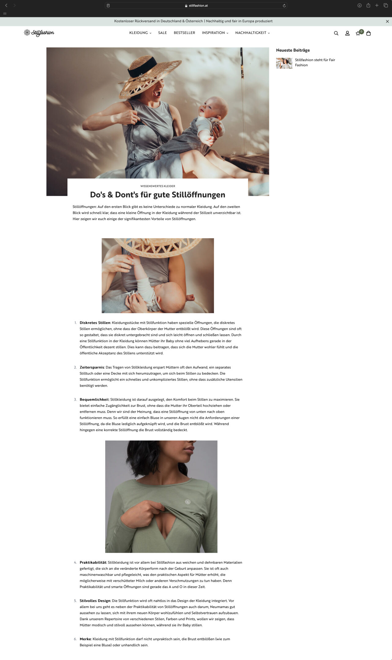 Im Rahmen des Relaunches der Stillfashion-Website war ich zudem verantwortlich für den gesamten Bereich der Blogbeiträge. Ich habe sämtliche Artikel konzipiert, verfasst und optimiert, die auf der Website veröffentlicht wurden und auch über den monatlichen Newsletter an die Kundinnen verschickt wurden. Dabei lag mein Fokus auf der Erstellung relevanter, zielgruppenspezifischer Inhalte, die nicht nur die Expertise der Marke im Bereich Stillmode unterstrichen, sondern auch einen Mehrwert für die Leserinnen boten. Die Blogbeiträge wurden strategisch in Einklang mit der Markenbotschaft und den Bedürfnissen der Zielgruppe entwickelt, um Engagement zu fördern und eine langfristige Kundenbindung zu schaffen.